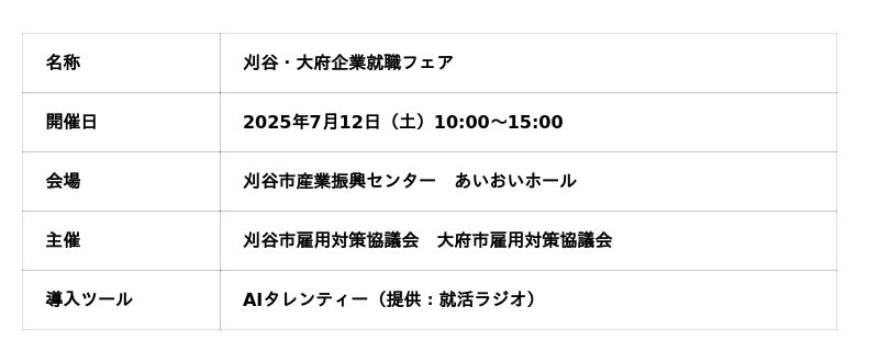 「働くその先に喜びを感じられる社会を作る」をミッションに掲げる株式会社就活ラジオ(本社:富山県富山市、代表取締役:碓井 一平)は、2025年7月12日(土)に開催される「刈谷・大府企業就職フェア」において、当社が提供するマッチングツール「AIタレンティー」を試験導入していただくこととなりました。