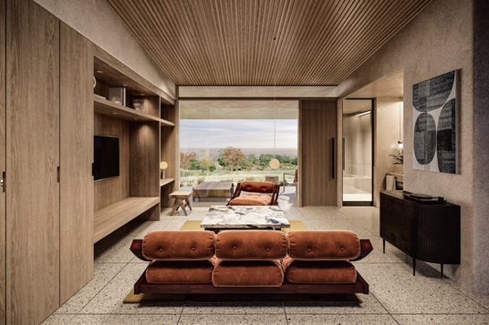 全室にプライベートサウナとテラスを備え、軽井沢の澄んだ空気と静寂を楽しめる空間をご用意しました。室内の設えは自然素材を活かしたミニマルな美しさで構成され、心地よい余白と開放感が、深い安らぎへ導きます。