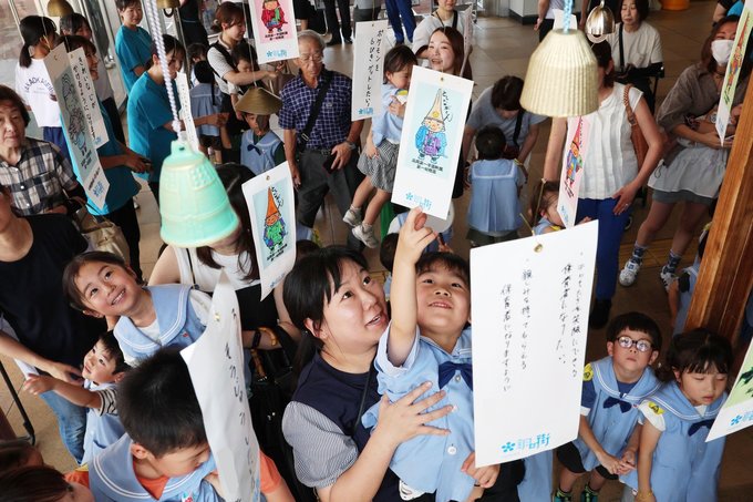 園児は童謡「たなばたさま」を合唱。「風鈴さん高岡のまちを涼しくしてね」と声をそろえた。「クレーンゲームがほしい」との願いを書いた鍛冶京佑ちゃん(5)は「音がきれい。願いがかなったらいいな」と笑顔で話した。