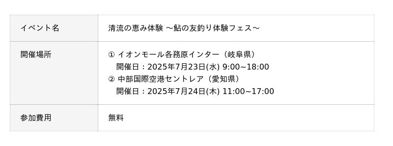 郡上鮎の会では、2025年8月3日に開催される「中高生鮎友釣りワールドカップ」に先がけ、体験型PRイベント「清流の恵み体験 ~鮎の友釣り体験フェス~」をイオンモール各務原インターおよび中部国際空港セントレアで開催します。清流長良川の自然と伝統を五感で楽しむ、夏の特別体験イベントです。