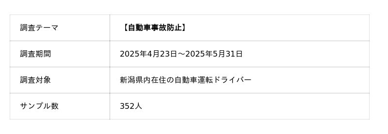 特に、公共交通機関が限られる新潟県において、自動車は生活に不可欠です。それゆえに「一日でも長く運転したい」という高齢ドライバーの想いと、「万が一の事故が心配」というご家族の想いがすれ違い、問題となっています。交通事故や高齢運転者による社会課題が注目される中、当社では『日常的に車を運転する人々がどんな不安を抱えているのか』を明らかにするため、新潟県内のドライバー352名を対象に交通安全に関するアンケート調査を実施しました。