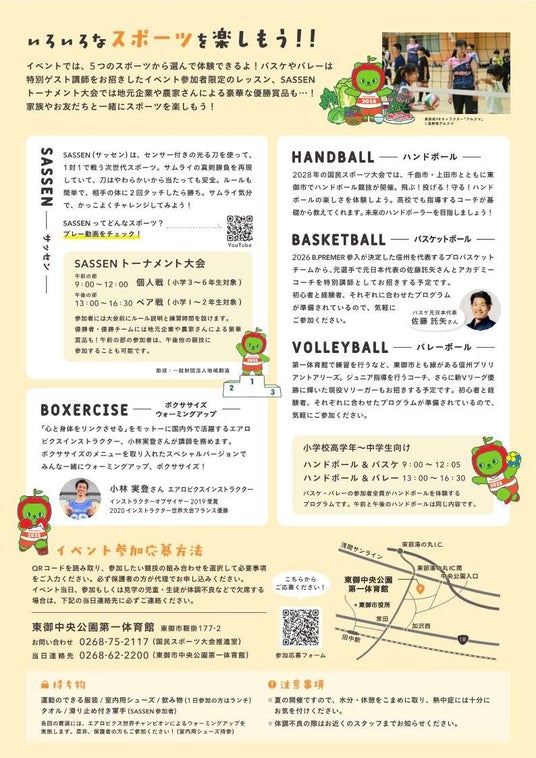 バスケットボール・バレーボール・ハンドボールの国スポ競技のほか、ボクササイズやいま話題のデジタルスポーツ「SASSEN(サッセン)」が楽しめる特別な一日。