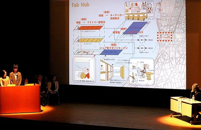 日本初のアクリル製トンネル水槽から着想し、水族館をトンネル型の建物にリニューアルする、自然や交流、産業などテーマごとに人が集う拠点をつくるといった提案があった。競技の審査委員長で国学院大教授の西村幸夫さんがコーディネーターを務めた。