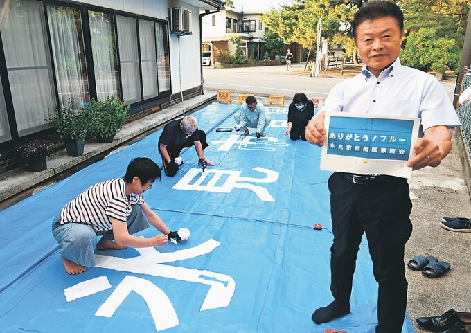富山県の氷見市自衛隊家族会は、能登半島地震からの復興を願い8月2日の「ひみまつり」で行われる航空自衛隊アクロバットチーム「ブルーインパルス」の展示飛行で、パイロットたちに感謝の気持ちを伝えようと「ありがとうブルー! 氷見市自衛隊家族会」と書いた横断幕を掲げる。同市島尾の同会事務局、浜下啓雄(けいお)さん宅で製作に励んでいる。