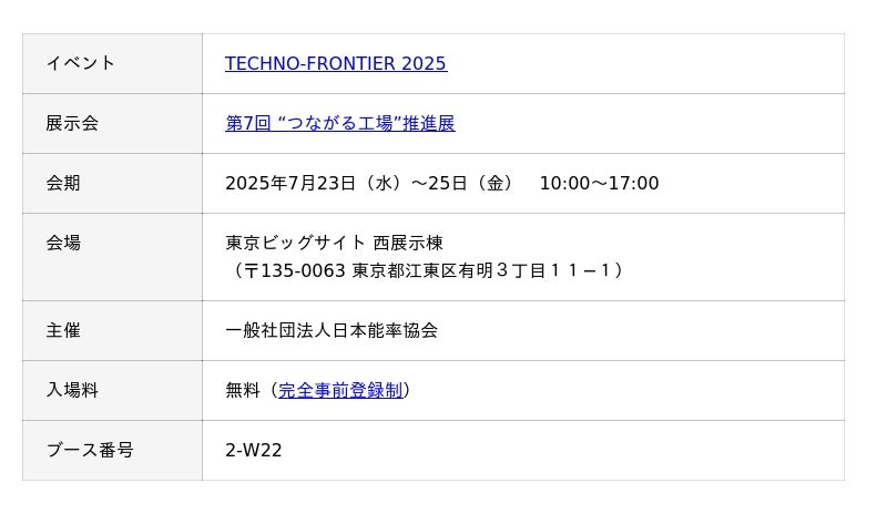 株式会社テクノア(本社:岐阜県岐阜市、代表取締役:山崎 耕治)は、7/23~25に東京ビッグサイトで開催される「TECHNO-FRONTIER 2025」に出展いたします。