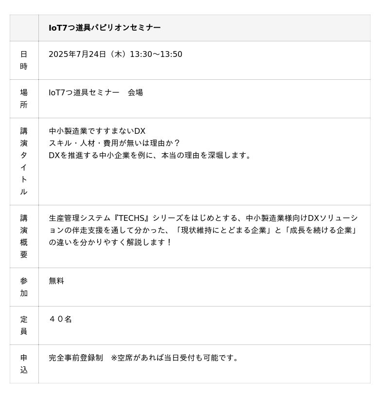 また、7/24(木)には、IoT7つ道具セミナー『中小製造業ですすまないDX スキル・人材・費用が無いは理由か?DXを推進する中小企業を例に、本当の理由を深堀します。』を開催いたします。