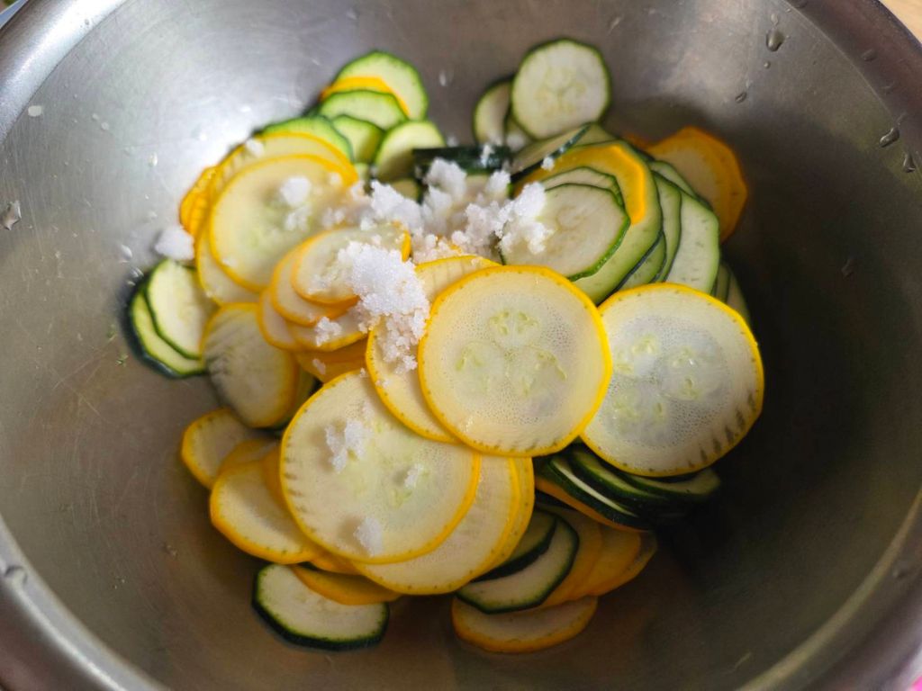 ① ズッキーニは薄切りにし、塩を加えてもみ込み10分置く。