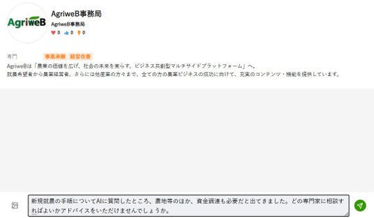 JAグループである農林中央金庫が開設した農業経営相談プラットフォーム。2025年4月より分社化した株式会社AgriweBに事業を移管。無料で閲覧可能な農業経営に着眼した独自コンテンツを掲載しているほか、農業者と農業者を取り巻く農業関係人口が繋がり持てるような掲示板機能、ダイレクトメッセージ機能等を具備。各企業と連携のうえ、農業分野で回答深度が深いAI機能、積算温度機能等を具備した気象情報アプリ等のサービスも展開している。