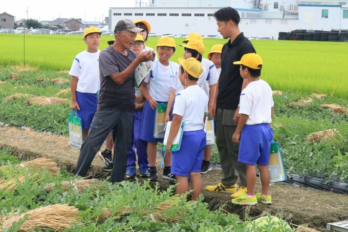 町のふるさと教育推進事業の一環。全6小学校の5年生を対象に15~25日に実施し、ジャンボ西瓜の試食も行う。