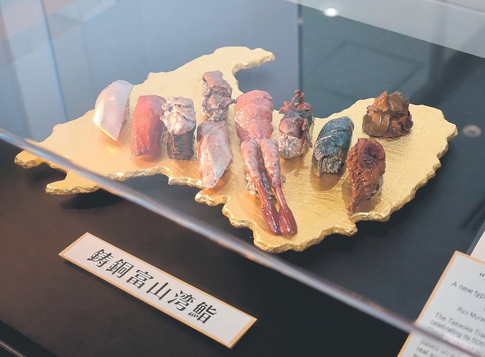 伝統工芸高岡銅器振興協同組合(竹中伸行理事長)が創立50周年を記念して制作し、今年3月に完成した鋳銅製の実物大のすしのオブジェ「鋳銅富山湾鮨(ずし)」の常設展示が17日、富山県民会館(倉田千春館長)で始まった。