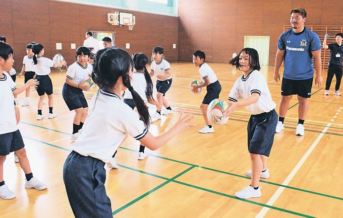 ラグビー国内最高峰のリーグワンの強豪、埼玉パナソニックワイルドナイツの選手を招いたラグビー教室が18日、富山県魚津市の経田小学校で行われ、3、4年生32人が競技の魅力に触れた。