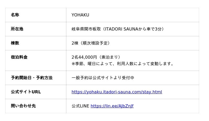 2025年7月19日、岐阜県関市板取に年間約1万人が訪れる川サウナ施設「ITADORI SAUNA」が手がける、サウナ付き一棟貸し宿「YOHAKU(ヨハク)」がグランドオープンしました。