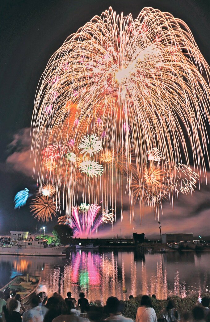 花火は午後8時10分にスタートした。滑川漁港の灯台周辺と海上の船など計4カ所から次々と打ち上がり、大勢の見物客らが光のショーを楽しんだ。フィナーレで名物の正3尺玉がごう音とともに大輪を描くと、大きな歓声が上がった。