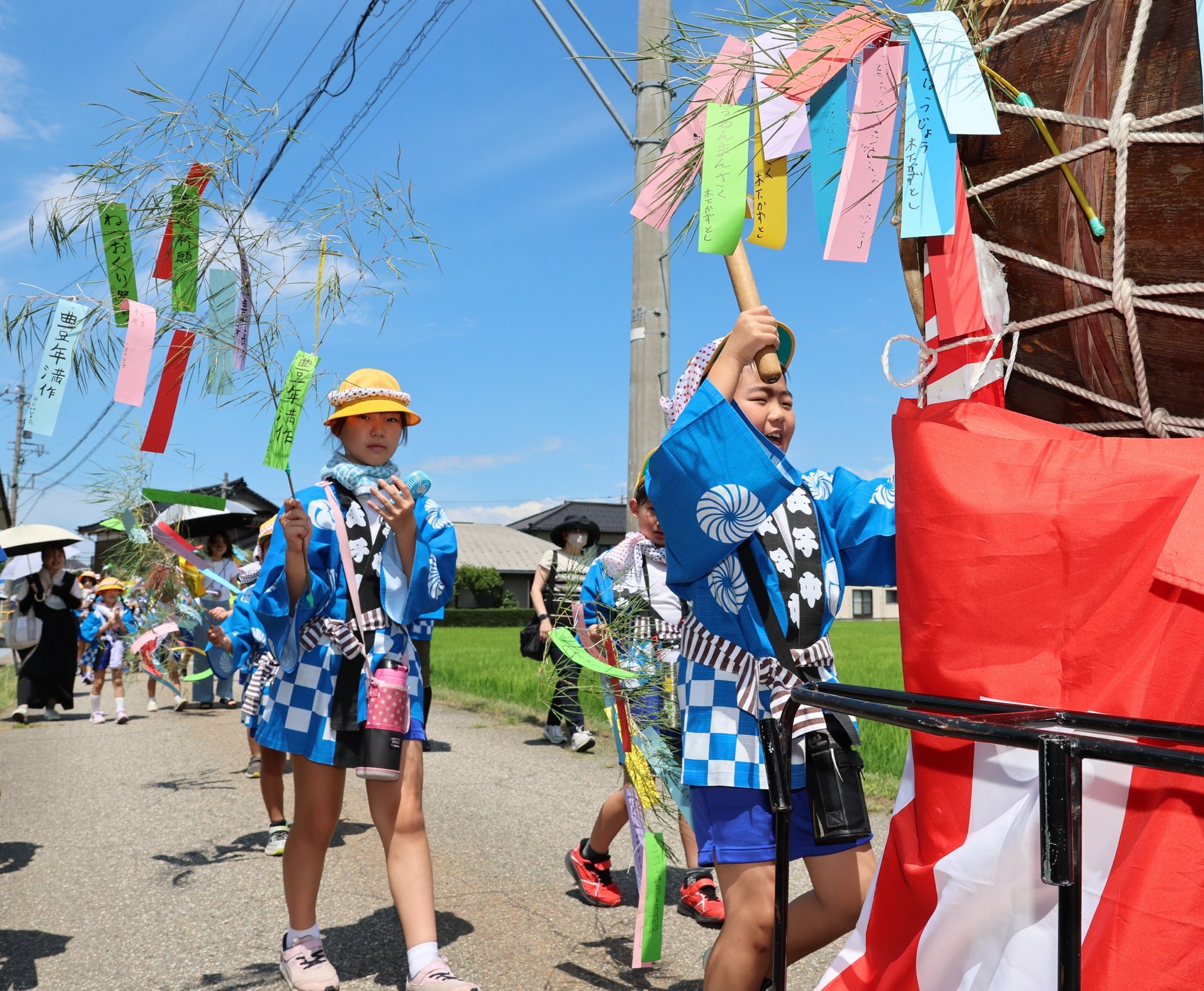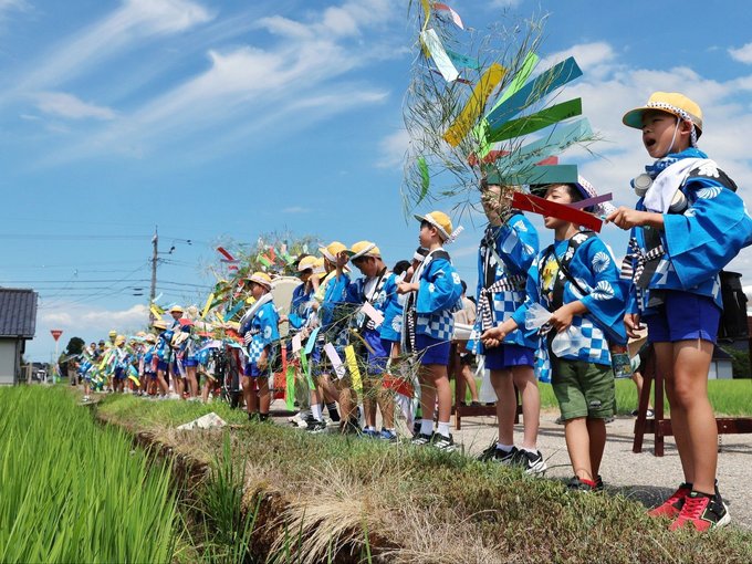 稲の病害虫を払う富山県の南砺市無形民俗文化財の「荒木ねつおくり祭り」が21日、同市福光地域の荒木地区で行われた。地元の小学生33人が真夏の日差しを浴びながら、田んぼ沿いでササ竹を振って豊作を祈った。