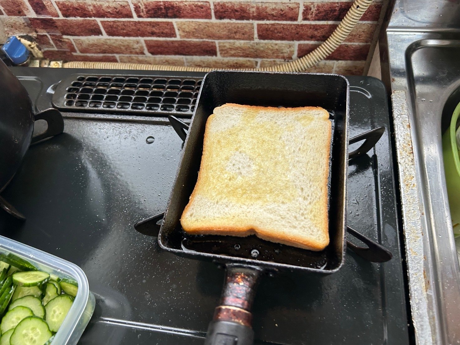 ③フライパンにバターを入れ、その溶かしバターでパンを焼く