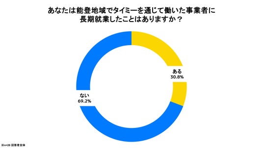 ワーカーに対して、タイミーを通じて働いた能登地域の事業者に長期就業(タイミーを介さずアルバイトや正社員として就業すること)したことがあるかを尋ねたところ、約3割のワーカーが経験があると回答しました。その理由としては、「地元だから(長期的に働くことにした)」といった意見が見られ、地域内で求職活動をされている方の長期的な雇用の創出にも貢献していることが分かりました。