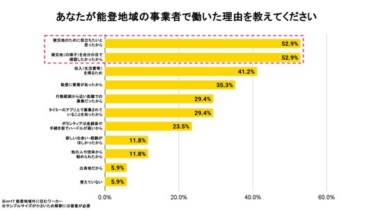「被災地(の様子)を自分の目で確認したかったから(52.9%)」「被災地のために役立ちたいと思ったから(52.9%)」といった回答も多く、復興支援の目的でタイミーを通じて働いている傾向がありました。