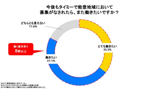 また今後もタイミーを通じて能登地域で働く意向がある人(「とても働きたい」35.3% +「働きたい」47.1%)は全体の8割以上という結果になり、タイミーでのマッチングを通じて能登地域に関わることに対して肯定的な回答が大半でした。その理由として、以下のようなコメントが寄せられています。