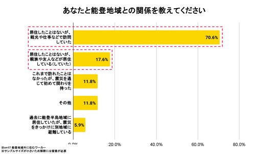 能登地域外に居住する回答者(17名)に能登地域との関係性を尋ねたところ、「居住したことはないが、観光や仕事などで訪問していた(70.6%)」や「居住したことはないが、親族や友人などが居住している(していた)(17.6%)」などの回答が見られました。これまで能登地域に何らかの関わりがあった方が、タイミーを通じて働きにきている傾向にあることがわかります。