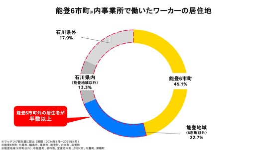 発災以降、能登6市町(※2)内の事業所で働いたワーカーの居住地を集計したところ、能登6市町の居住者が46.1%と最も多くなりました。一方、6市町以外の能登地域居住者(22.7%)、金沢以南の県内居住者(13.3%)、県外居住者(17.9%)と、能登6市町以外の地域からのワーカーが半数以上を占めることも分かりました。また、能登地域外の居住者(金沢以南の県内居住者+県外居住者)も全体の3割以上と、広域でのマッチングが実現していることが分かります。