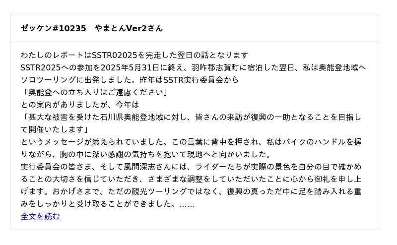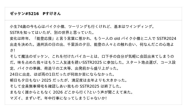 SSTR運営委員会(本社:東京・渋谷区、代表:風間深志)は、この度、「SSTR2025 AWARD」の受賞者を発表いたします。厳正な選考の結果、各部門の受賞者が決定いたしました。今年も数えきれないほどの感動と情熱が詰まったご応募をいただき、誠にありがとうございました。すべてのライダーの皆様に、心からの拍手をお送りいたします。