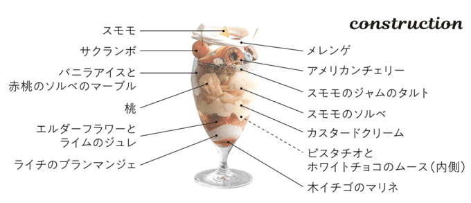 純白のメレンゲの輪の下には、スモモ(プラム)やサクランボなど旬の赤い果実が並ぶ。目が覚めるような甘酸っぱさが口の中にはじける。グラスの中には、赤桃のソルベにライチのブランマンジェ。濃密でクリーミーな層もあれば、さっぱりした甘さの層もあり、味や香りが万華鏡のように変化する。タルトやジュレなど、パティスリーならではの多彩なパーツが詰まったパフェだ。グラスの底の真っ赤な木イチゴのマリネまで、わくわくするような夏の気配に満ちている。