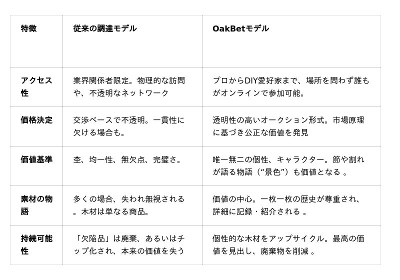 「OakBet」は、従来の一部関係者に閉じていたユニークな木材へのアクセスを、テクノロジーの力で全ての作り手に解放します。その革新性は、従来の調達モデルとの比較によって明確になります。