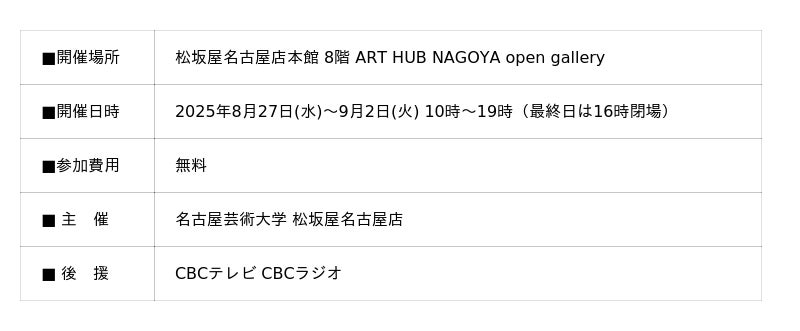 8月27日(水)10時から松坂屋名古屋店本館 8階 ART HUB NAGOYA open gallery 入場無料