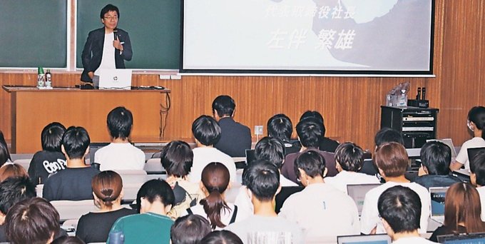 ゴールドウインの特別講義が25日、富山大五福キャンパスで開かれ、ユニホームサプライヤーを務めるサッカーJ2カターレ富山の左伴繁雄社長が講師を務めた。クラブや両社で連携して行う取り組みが地域に与える影響について、学生に伝えた。