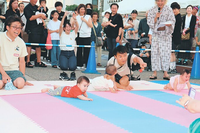 なんと福光ねつおくり七夕祭りは2日目の26日、富山県南砺市福光の東町交差点特設会場で「2932(ふくみつ)赤ちゃんハイハイレース」を行った。