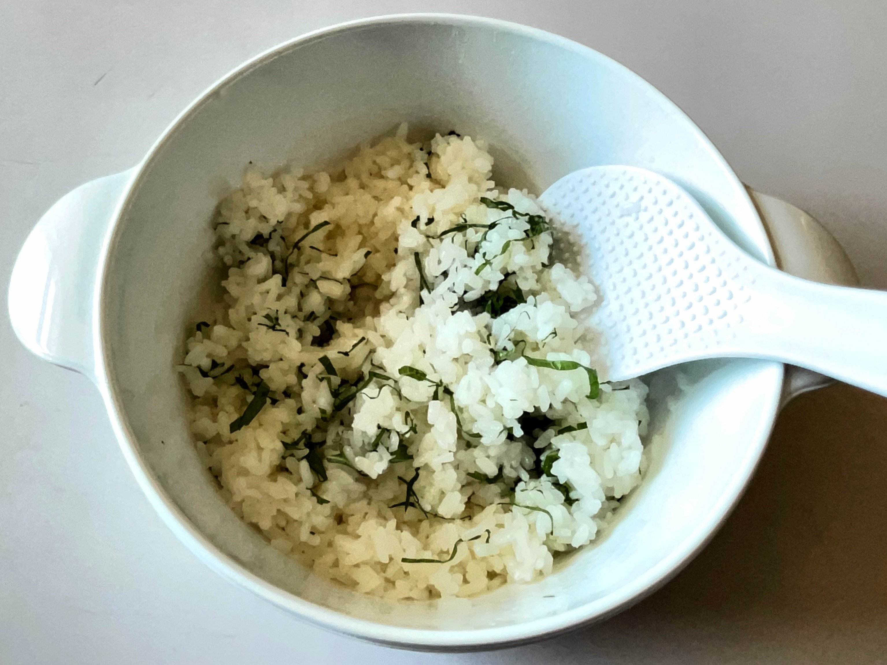 ①温かいご飯に、酢・砂糖・塩を混ぜ、しゃもじでさっと切るように混ぜ、粗熱が取れたら⻘じそを加える。