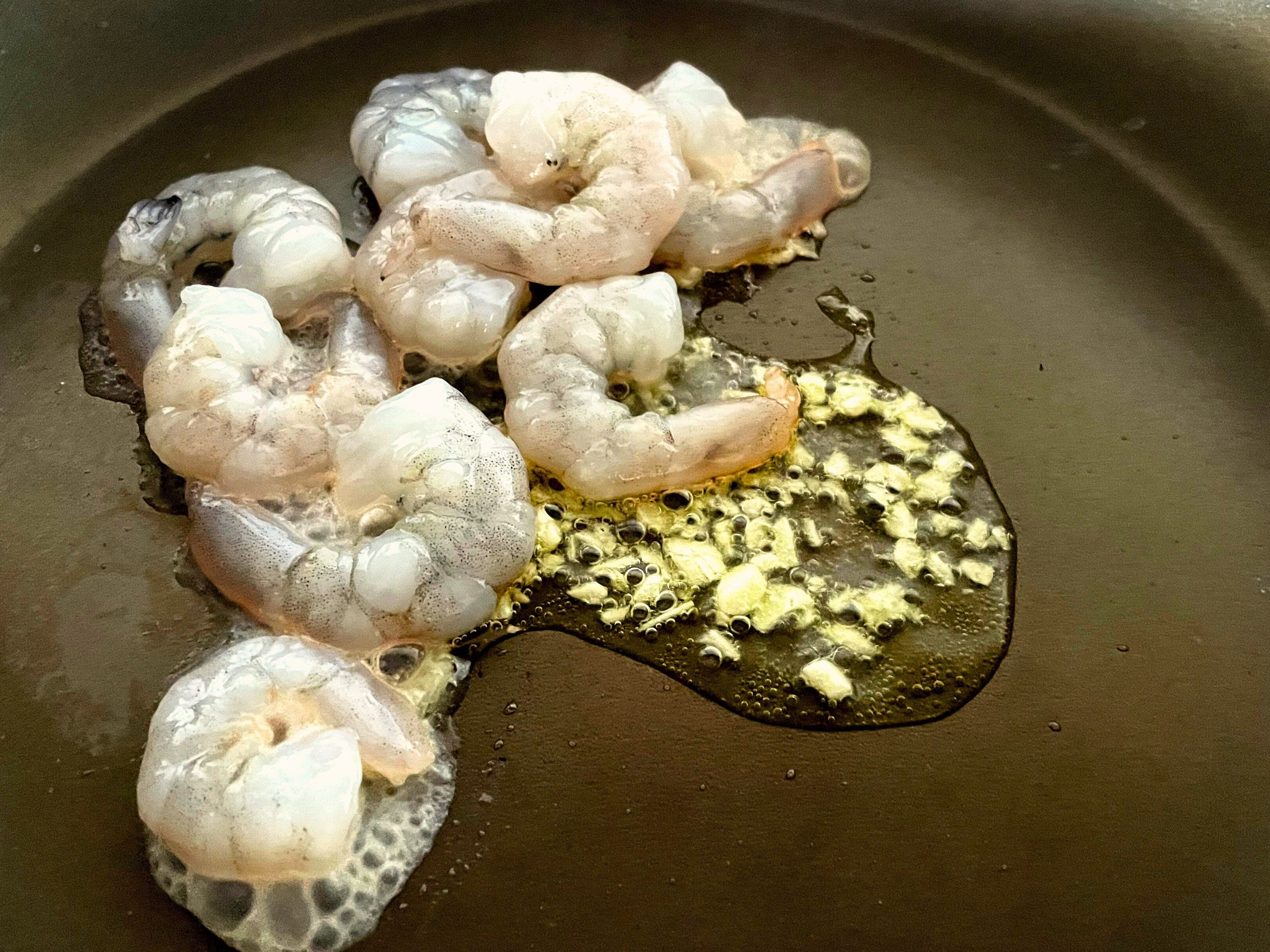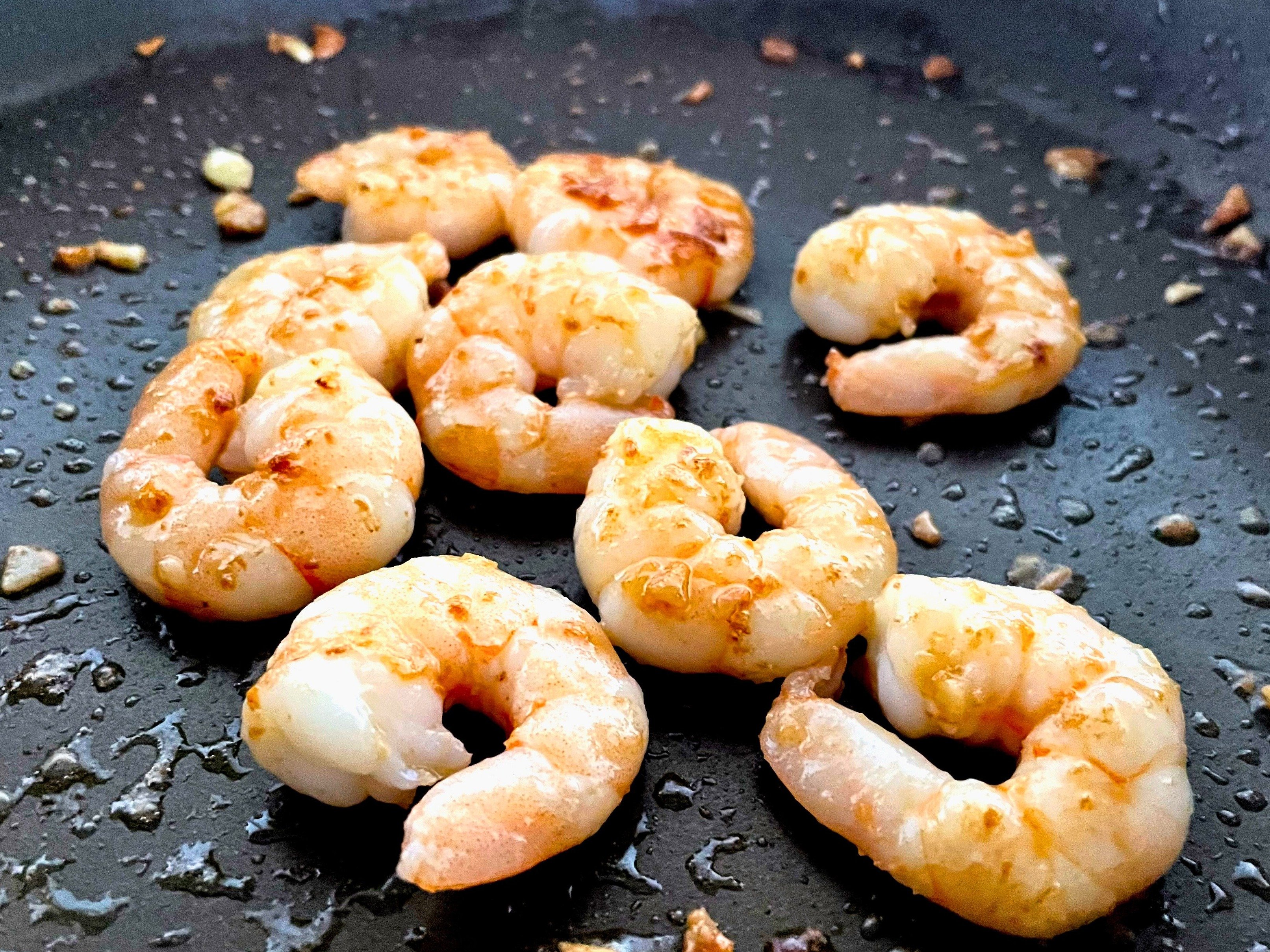②フライパンにオリーブオイルとにんにくを⼊れて弱⽕で⾹りを出し、エビを加えて炒める。⽕が通ったら、レモン汁・塩・こしょうを加えてサッと炒め、粗熱を取る。