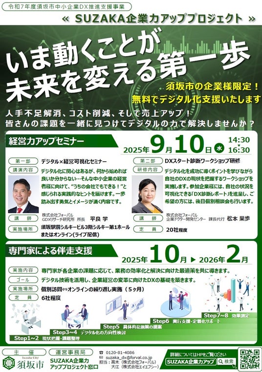 『「新しいあたりまえ」で、新しい世界を創るFORVAL』を理念に掲げ、ESG経営を可視化伴走型で支援する「企業ドクター(次世代経営コンサルタント)集団」の株式会社フォーバル(本社:東京都渋谷区、代表取締役社長:中島 將典、以下「フォーバル」)は 、長野県須坂市(市長:三木 正夫)より、令和7年度「中小企業DX推進支援業務」を受託しました。