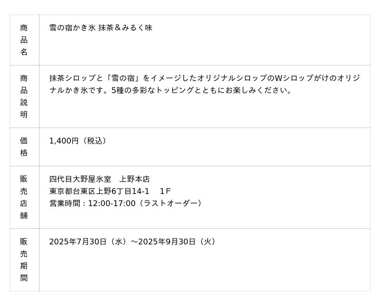 三幸製菓株式会社(所在地:新潟市北区)は、株式会社アイスイノベーション(本社:東京都台東区)が運営する人気店・上野かき氷専門店「四代目大野屋氷室」とコラボレーションし、三幸製菓の代表商品「雪の宿」をイメージした「雪の宿かき氷 抹茶&みるく味」を開発し、「四代目大野屋氷室」にて2025年7月30日(水)から2025年9月30日(火)の期間限定で販売いたします。