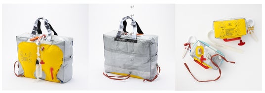 このグッズは、飛行機の不時着時やトラブル発生時に使用を想定しているエスケープスライドと、お客さまをお守りするために搭載している航空機用ライフベスト生地を組み合わせ、それぞれ定期交換のために取り下ろしたものを再利用したもので、1点1点使用している部位が異なるオリジナル商品となります。
