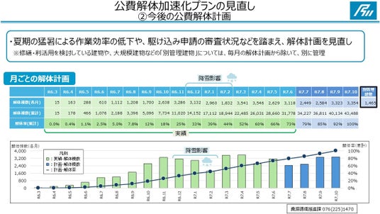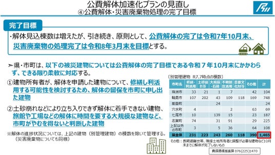 なお、今回の見直しにより、解体見込棟数は増えましたが、従来どおり、原則、公費解体の完了は令和7年10月末、災害廃棄物の処理完了は令和8年3月末を目標としています。