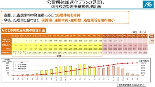今後の公費解体計画については、夏期の猛暑による作業効率の低下や、駆け込み申請の審査状況などを踏まえた計画に見直しています。また、当面、災害廃棄物の発生量に応じた処理体制を維持し、今後、処理量にあわせて、仮置場、運搬車両、船舶、処理先等を順次縮小していくこととしています。
