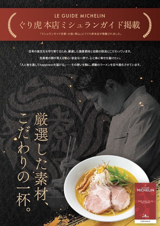 岡山県で「日本の素晴らしい食材、食文化を守り育てる一杯」をコンセプトに、厳選した食材を使用してラーメンを提供している「麺処ぐり虎」はミシュランガイド京都大阪岡山掲載店。素材の味を最大限に引き出し、「イタリアン」と「和」の技法を入れ込み至高のラーメンを作り上げました。麺、醤油・塩ダレ、お出汁、全てが「ぐり虎のこだわり」です。