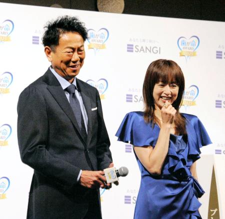 俳優の東幹久と高岡早紀が東京都内で開かれた「サンギ歯が命アワード2025」のイベントに登場した。1990年代に「芸能人は歯が命」のキャッチフレーズを掲げたサンギの歯磨き剤「アパガード」のCMで話題となった2人の再共演だ。