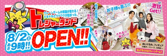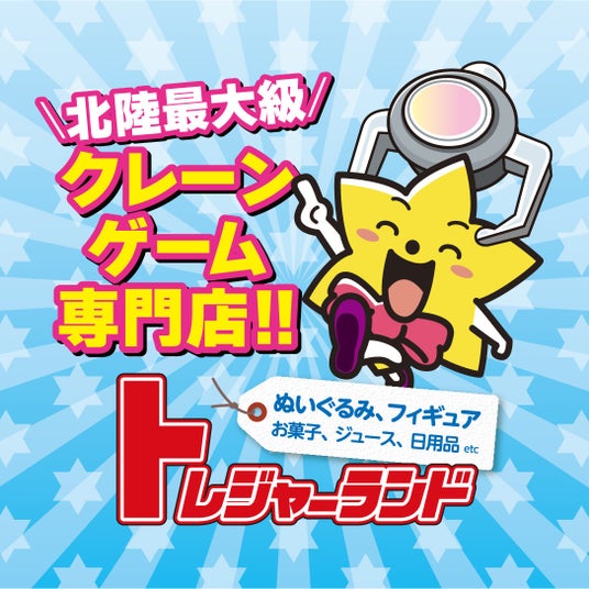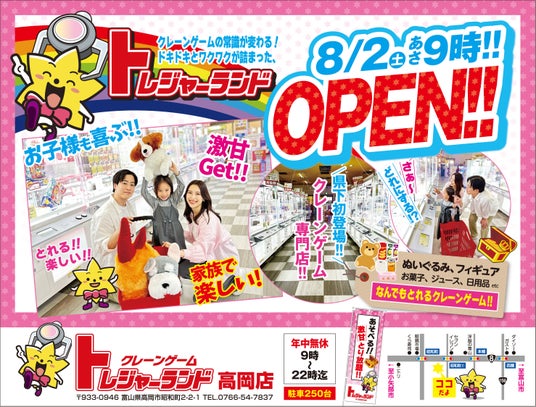 株式会社山崎屋(本社:石川県金沢市、代表取締役社長:高登 恵子)は、クレーンゲーム専門店『トレジャーランド高岡店』を2025年8月2日、富山県高岡市にグランドオープンいたします。