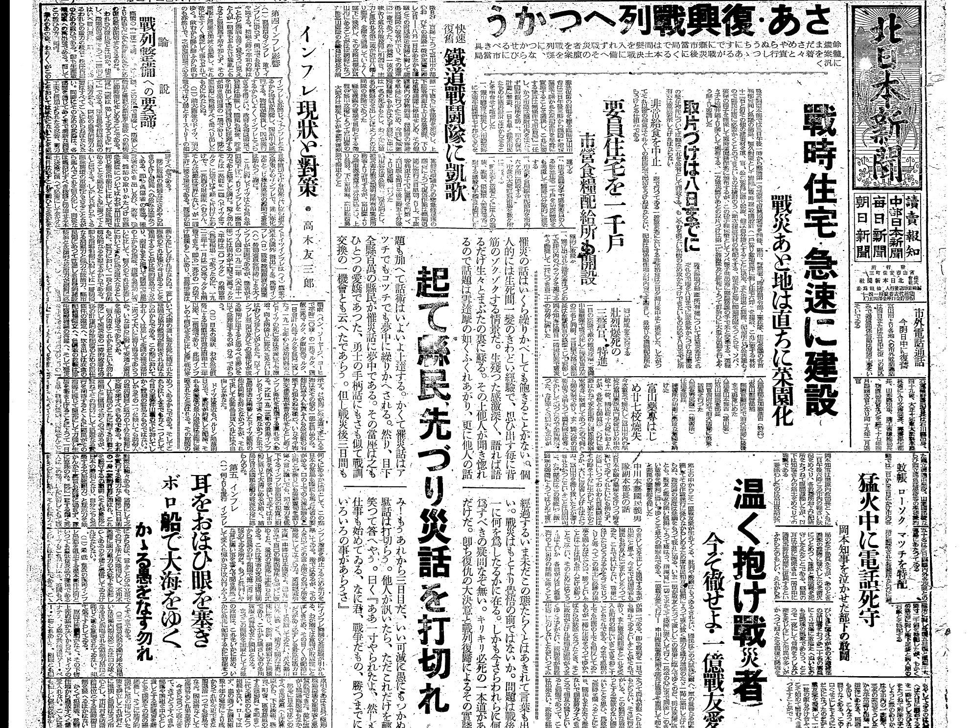 3日1面トップ記事では「敵が焼かうとして、焼き得なかった、大和魂がこのあつく熱した灰土の底に活き活きと鼓動し溌剌(はつらつ)たる生気をよみかへらせつつあるのだ」と鼓舞している。