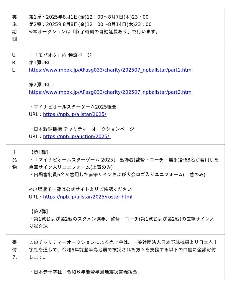 株式会社モバオク(本社:東京都渋谷区、代表取締役社長:小一原 宏樹、以下モバオク)が運営するオークションサービス「モバオク(https://www.mbok.jp/)」は、プロ野球12球団と一般社団法人日本野球機構(以下、日本野球機構)が実施する「マイナビオールスターゲーム2025 チャリティーオークション」を2025年8月1日(金)から開始します。