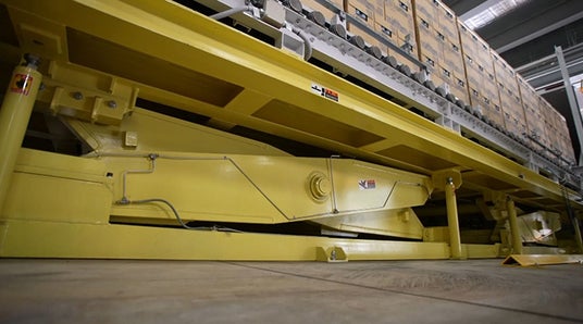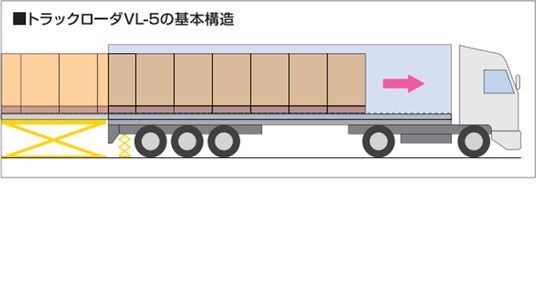 VL-5は自動倉庫から出庫される製品パレットをストレージ部(駆動ローラコンベヤで構成)で1車分溜め置き、トラック(荷台にフリーローラ装着)後部から一挙に送り込むローディング装置です。
