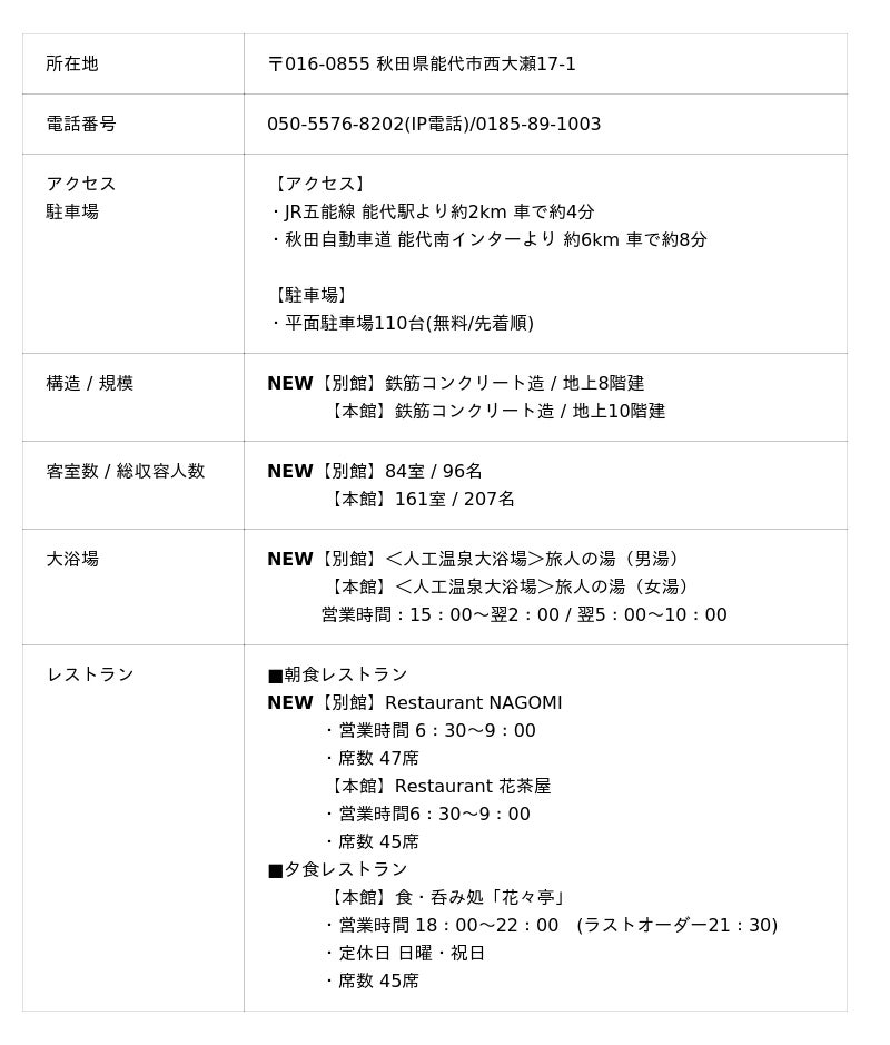 JR五能線 能代駅から車で約4分、秋田自動車道 能代南ICより車で約8分に位置し、無料駐車場は100台以上収容可能。