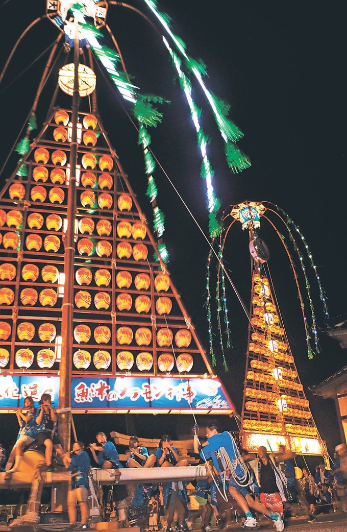 諏訪町1~5区と港町、元町の7基がちょうちんを下げて神社周辺に勢ぞろいし、夏の夜空を華やかに彩った。午後8時55分に引き回しがスタート。笛や太鼓、若衆のかけ声が響く中、境内で1基ずつ威勢良く回転すると、大きな拍手と歓声が沸き起こった。