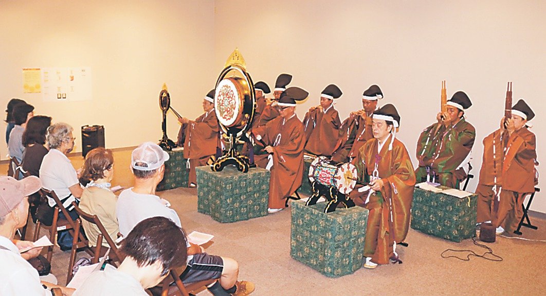 3日は、江戸時代からの歴史がある高岡市の雅楽団体「洋遊会」の演奏会も開かれ、展示室に彩りを添えた。期間中は、上市中学校美術部の生徒たちがデザインした清少納言のキャラクターが、枕草子について解説する動画放映も行っている。共同展は北日本新聞社共催。