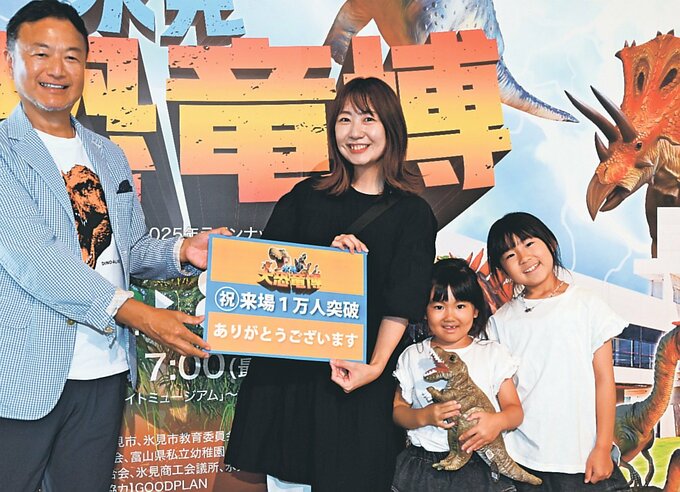 富山県の氷見市芸術文化館で開かれている「氷見 大恐竜博」の入場者が3日、1万人を超え、節目に訪れた富山市下堀の加治日和(ひより)ちゃん(6)=徳風幼稚園=に記念品が贈られた。