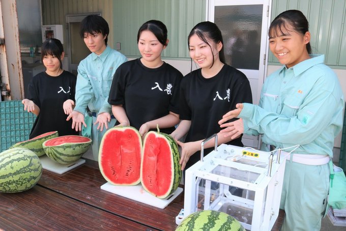 稲村朝妃さん(3年)は「味は従来品と同等のおいしさだった。後輩たちには形も甘さも良いスイカを目指してほしい」と話した。