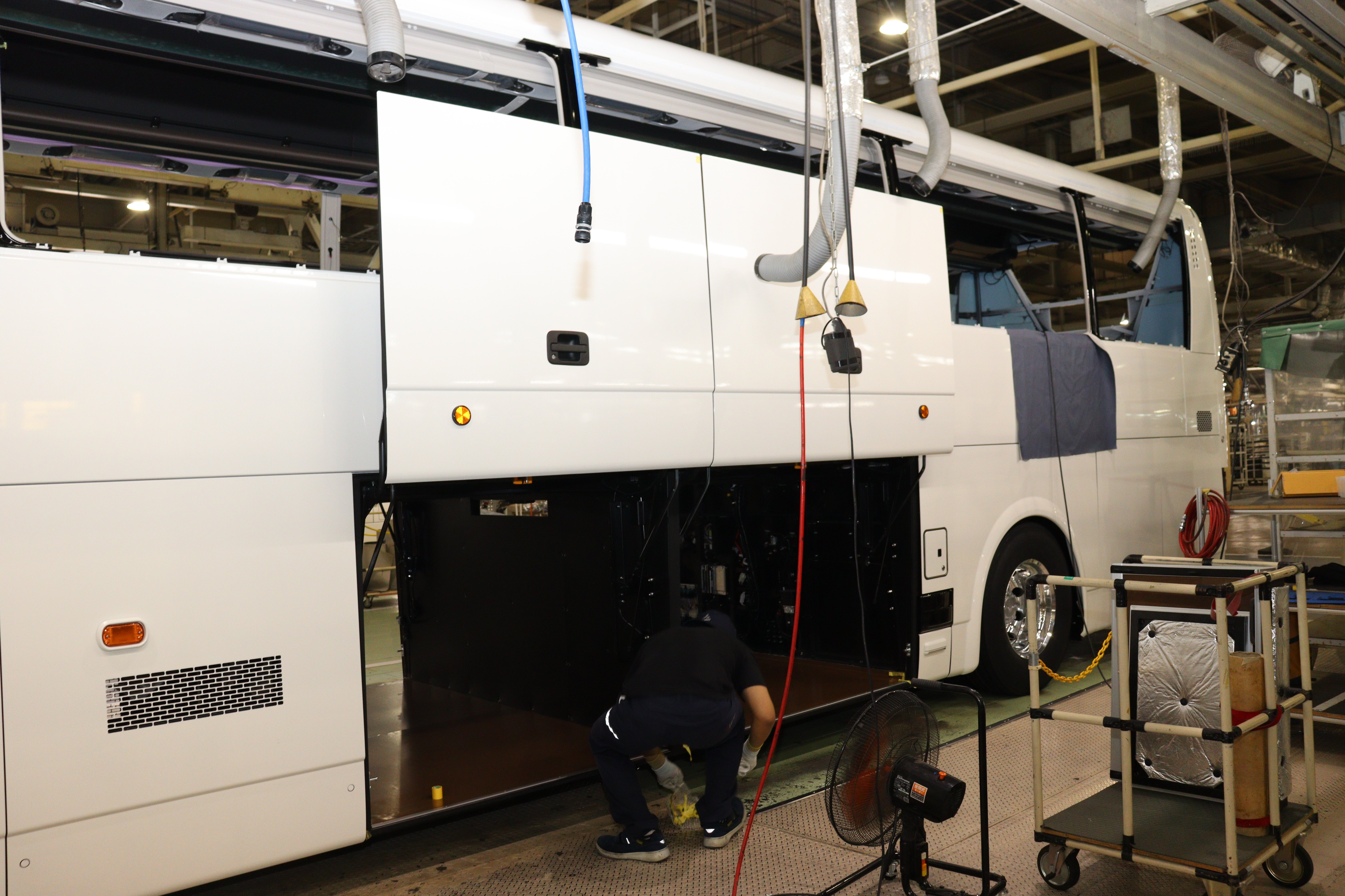 大型バスを製造する工場は国内でも3カ所しかありません。さらにクライアントのさまざまなニーズに応じる受注生産のため、ほぼ手作業で塗装や内装を行っています。