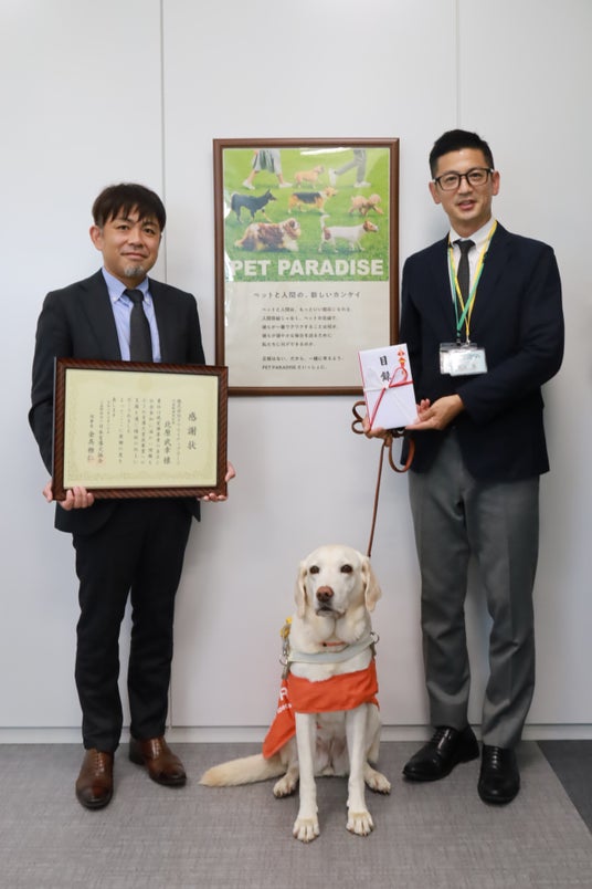 当社は、同協会の視覚障がい者の歩行を安全にサポートする盲導犬の育成および、障がいのある方々の社会参加・自立支援を目的とした活動に賛同し、支援を行っています。寄付金は、全国の「ペットパラダイス」店頭に設置された募金箱を通じてお客さまから集まったものです。